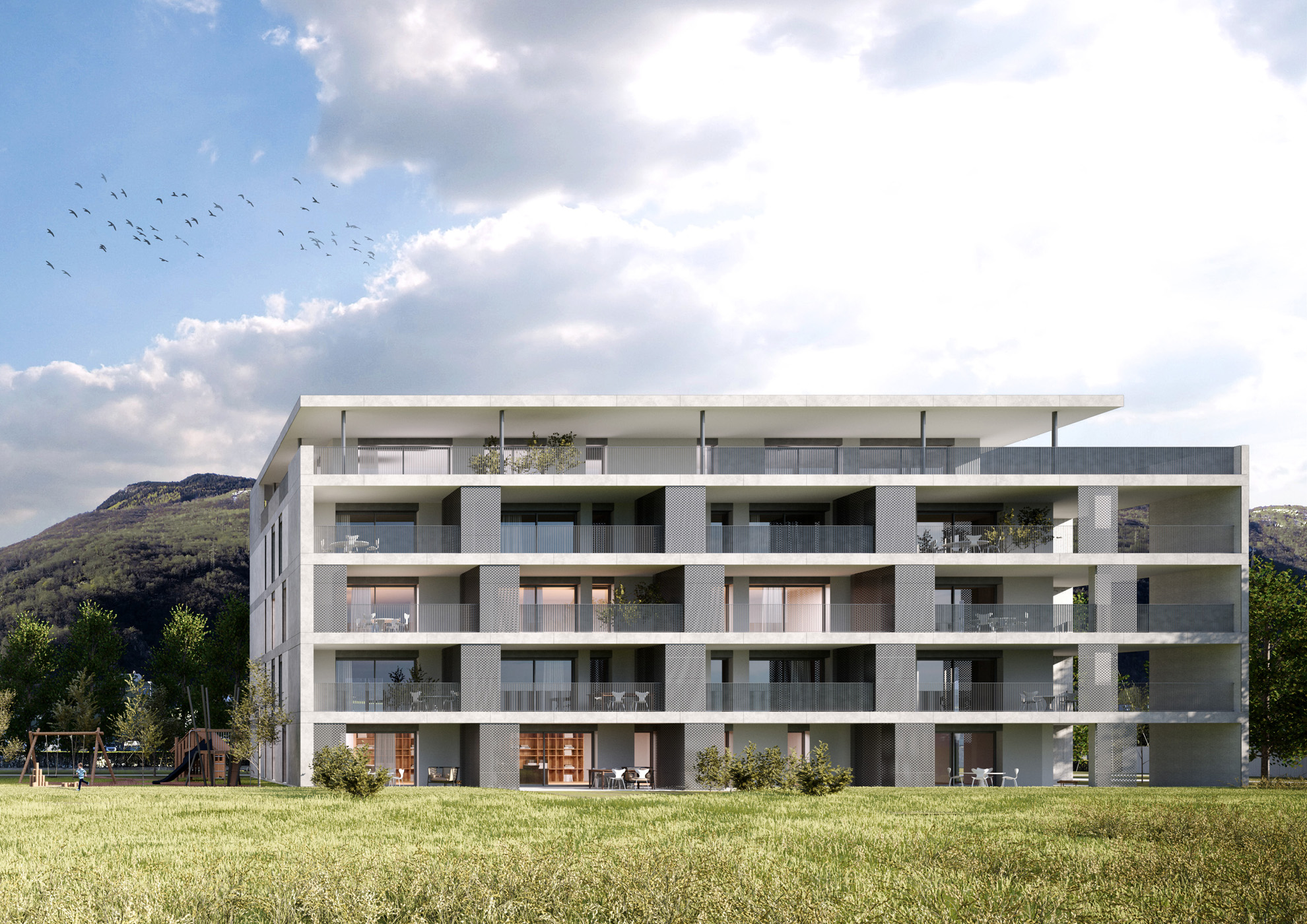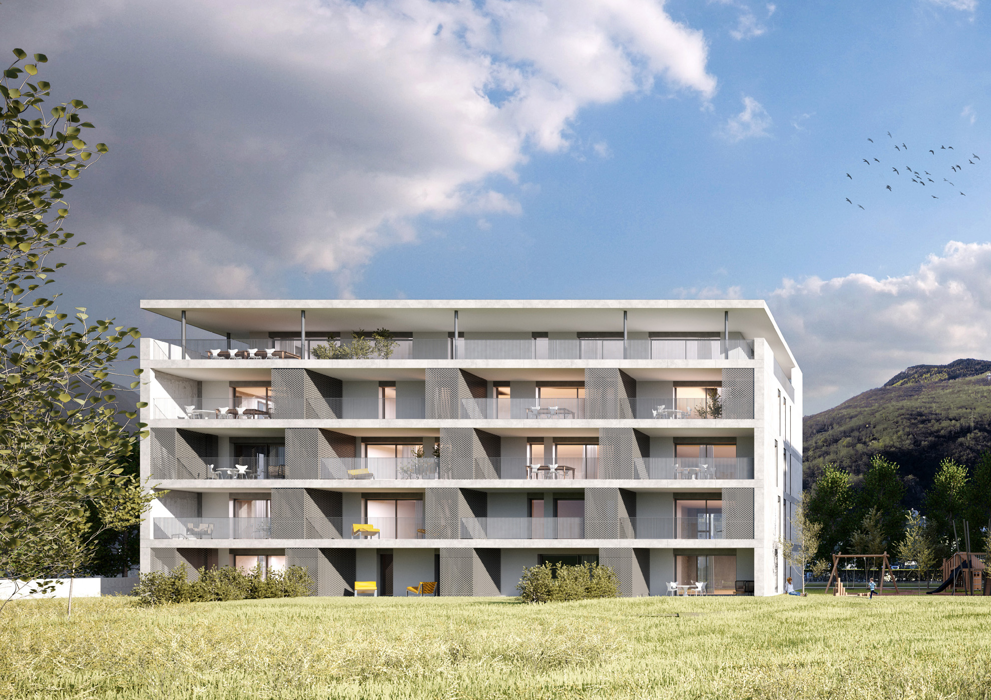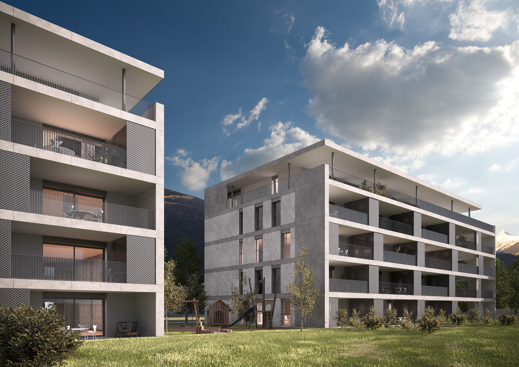 Il progetto è composto da due edifici di pianta rettangolare. L’architettura dell’edificio è caratterizzata dalle fasce marcapiano che scandiscono le facciate. L’ultimo piano si distingue inoltre anche grazie al perimetro retrocesso rispetto ai piani sottostanti e di differente materializzazione. Residenza 61 si identifica attraverso il rivestimento di facciata in ceramica, materiale non comunemente utilizzato per la finitura di palazzine residenziali. Gli stabili si sviluppano su cinque livelli fuori terra e sono collegati tramite il piano interrato. L’orientamento delle zone giorno è a Sud-Est, verso il centro di Bellinzona, con vista sui castelli. Le camere, invece, sono esposte a Nord-Ovest, verso Fiume Ticino. Al piano interrato sono ubicati i posteggi, i depositi, i locali tecnici e i posteggi per biciclette. Le lavanderie/cantine sono presenti a ogni piano e sono private per ogni appartamento. Al piano terreno si trovano i giardini privati, con accesso diretto dagli appartamenti. A Nord-Est e nella parte centrale tra i due edifici si sviluppano delle zone verdi comuni.